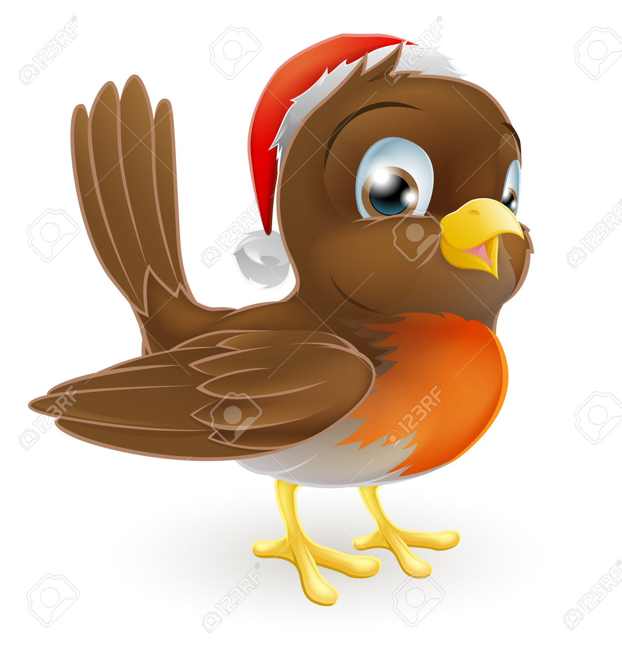 A Cartoon Robin Bird Wearing Christmas Santa Hat And Pointing