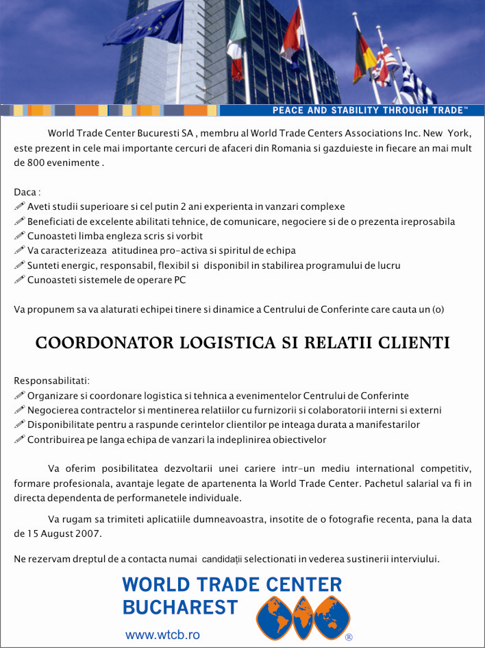 Coordonator Logistica Si Relatii Clienti World Trade Center
