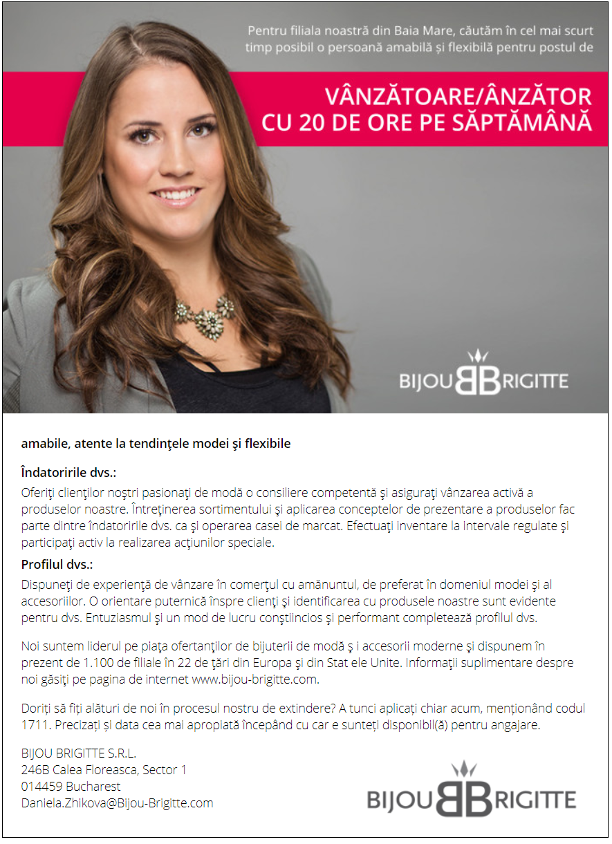 Vanzătoare Vanzător Cu 20 De Ore Pe Săptămană Baia Mare Bijou