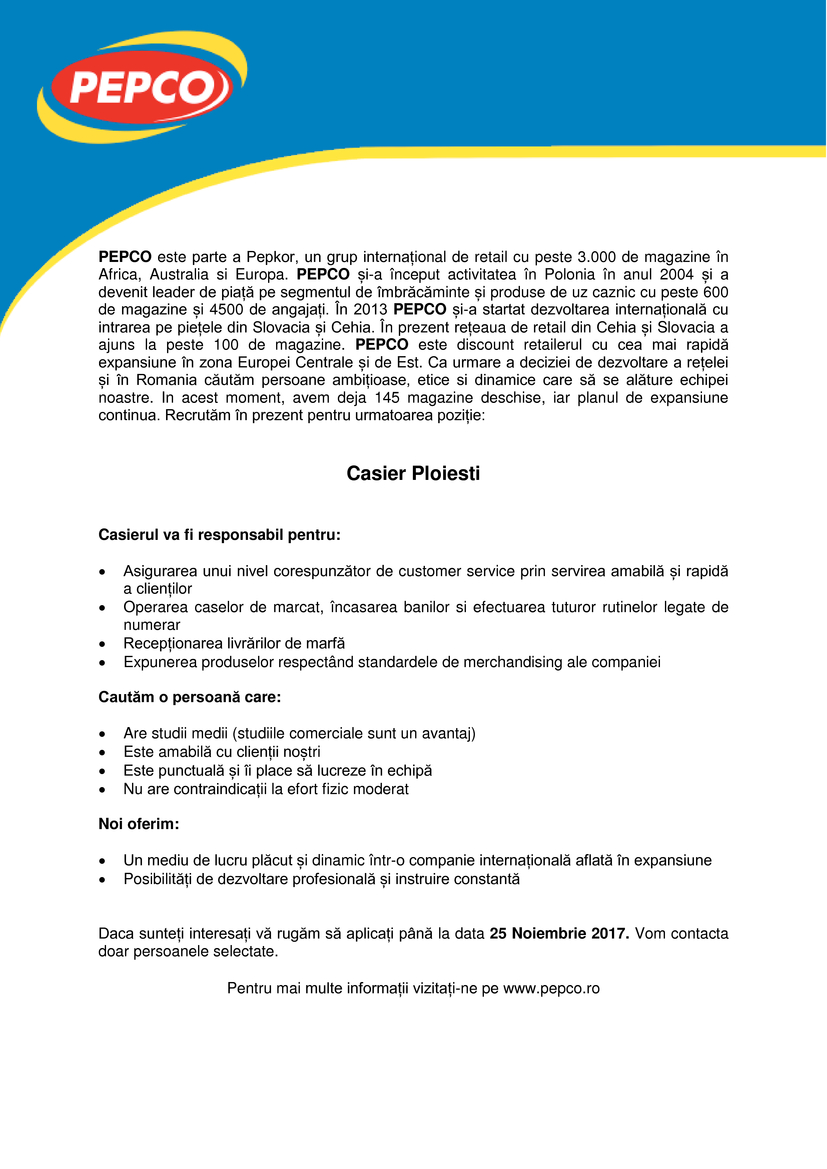 Casier Ploiesti Pepco Retail Srl Aplica Pe Ejobs