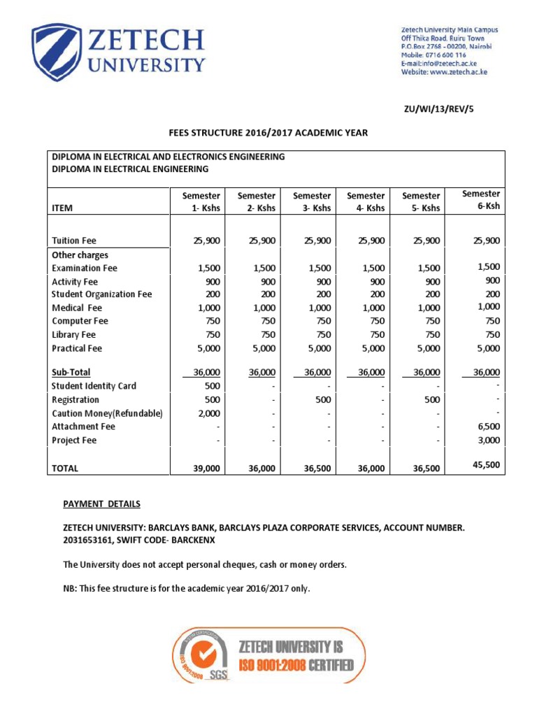 Item amount in kshs payment frequency. The registrar of academics of the zetech university has released the school fees structure to be paid by postgraduate and undergraduate degree diploma certificate and short course for both local and international students for the 2019 2020 academic. Application for hostels accommodation 1. Certi cate 500 diploma 500.