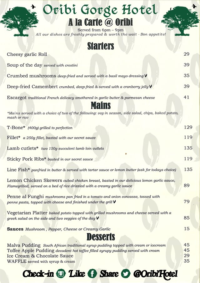 Oribi Gorge Hotel Menu